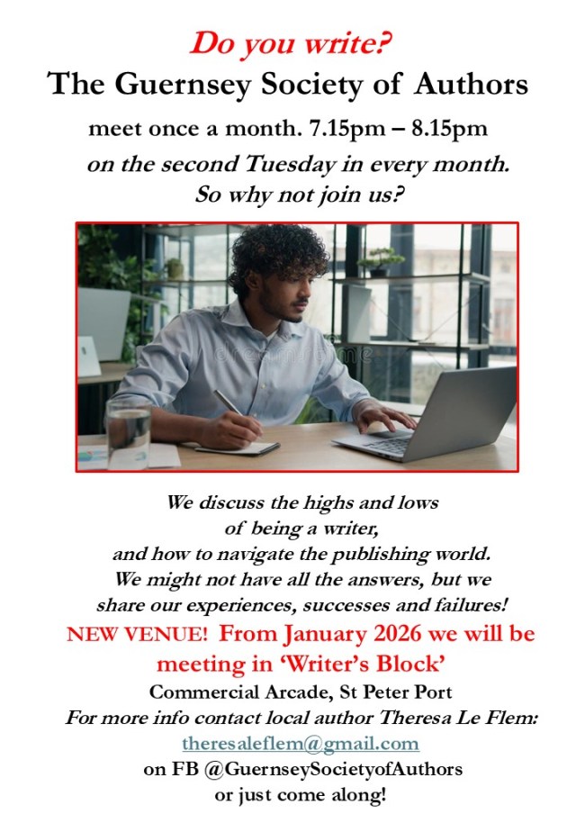 When Radio Guernsey producer spotted our poster in the local bookshop Writers Block – he phoned me to ask more about it. To my delight he invited me to talk about our new local group on BBC Radio Guernsey Steph Watkins morning show. It was really great! You should be able to listen to some of it here:
